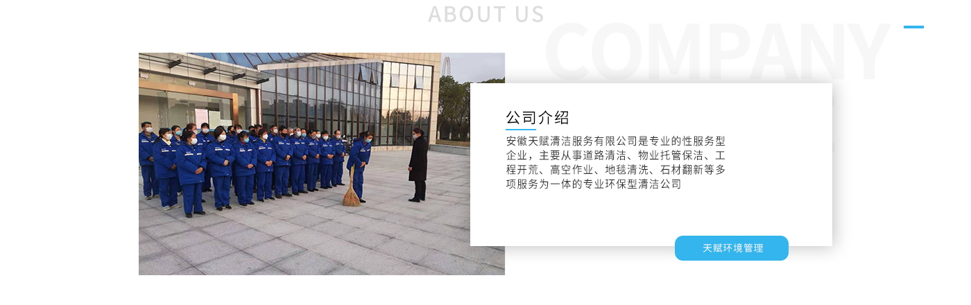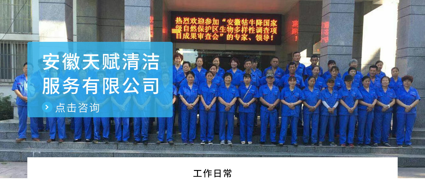 安徽天賦清潔服務(wù)有限公司是的服務(wù)型企業(yè),主要從事道路清潔、物業(yè)托管保潔、工程開荒、高空作業(yè)、地毯清洗、石材翻新等多項(xiàng)服務(wù)為一體的環(huán)保型清潔公司。公司管理機(jī)制完善,清潔作業(yè)經(jīng)驗(yàn)豐富,擁有技術(shù)力量,嚴(yán)格實(shí)行崗前培訓(xùn)—崗中督查—上崗在培訓(xùn)的員工管理措施,憑著優(yōu)良的清潔質(zhì)量和嚴(yán)格的督查管理,為眾多企事業(yè)單位、醫(yī)院、酒店、廠區(qū)商場(chǎng)、物業(yè)、道路、學(xué)校、公園等提供后勤清潔服務(wù)。在業(yè)內(nèi)擁有良好的口碑。工作人員,服務(wù)態(tài)度優(yōu),竭力為客戶提供好的保潔服務(wù)。安徽天賦清潔服務(wù)有限公司:致力于長(zhǎng)期合作關(guān)系,提高服務(wù)質(zhì)量,提供高標(biāo)準(zhǔn)的清潔服務(wù)。公司的經(jīng)營(yíng)理念:為營(yíng)造一個(gè)更清潔、亮麗的生活和工作環(huán)境而努力!“誠(chéng)信”是公司成功保證?!翱蛻糁辽希抛u(yù)為首”是公司宗旨。高標(biāo)準(zhǔn)提供服務(wù),維護(hù)客戶利益、形象,是我始終不渝的目標(biāo)。